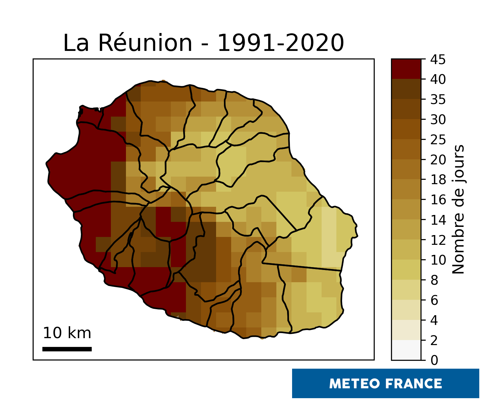 TempératuresÀ La Réunion, l’évolution de la température de surface est mesurée à partir des données issues de 3 stations possédant des mesures homogénéisées depuis plus de 50 ans, situées à diverses altitudes et sur différents secteurs de l’île (Gillot à 8 m, Pierrefonds à 21 m, Plaine des Cafres à 1560 m d’altitude). L’analyse des tendances révèle une hausse significative des températures moyennes de l’ordre de 0,19 °C par décennie (soit +1 °C en un demi-siècle), avec une accélération du réchauffement depuis les années 2000 (Figure 2). Les dix dernières années (2015-2024) présentent une anomalie moyenne de 0,5°C par rapport à la référence 1991-2020. Les trois années les plus chaudes se sont produites en 2019 (+1,0°C), 2023 (+0,9°C) et 2024 (+0,7°C). Il est important de noter que les observations intègrent l’effet de la variabilité interne et naturelle du climat et n’isolent pas la part du réchauffement dû aux activités humaines. Figure 2 : Ecart à la normale 1991-2020 de la température moyenne annuelle enregistrée à La Réunion depuis le début des observations (en °C). Les warming stripes (« bandes de réchauffement ») offrent une synthèse visuelle de ce réchauffement (Figure 3). Avec une période de référence 1991-2020, la plupart des années chaudes (bandes rouges) se sont produites après 2008. Figure 3 : Warming stripes de La Réunion pour les 3 stations de référence D’autres indicateurs permettent de mettre en évidence les effets du réchauffement climatique à La Réunion, comme le nombre de jours chauds, où la température maximale excède 31°C à la station de Gillot Aéroport (Figure 4). Ce nombre augmente notablement depuis 2010, passant de 18 en moyenne sur la période 1968-2009 à 42 en moyenne au-delà de 2010. Figure 4 : Nombre annuel de jours chauds (température maximale supérieure ou égale à 31°C) sur la station de Gillot depuis le début des observations. PrécipitationsLes systèmes tropicaux passant à moins de 1 000 km comptent pour un peu plus de 30 % des pluies à la Réunion, jusqu’à 50 % sur le relief de l’île (avec une forte variabilité entre les pluviomètres). En moyenne, un cyclone apporte 24 mm de pluie par jour sur l’île (de 10 mm/j sur les littoraux de l’ouest à 60 mm/j sur le relief). Le relief augmente de façon conséquente les pluies (Cornillaut et al. 2024, Cornillaut 2025). Les cumuls annuels moyens des précipitations sur les 7 zones climatiques de La Réunion montrent une plus grande hétérogénéité spatiale que pour la température en raison du relief marqué de l’île (Tableau 1).