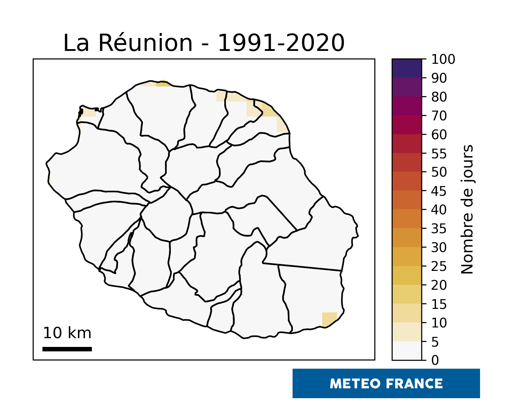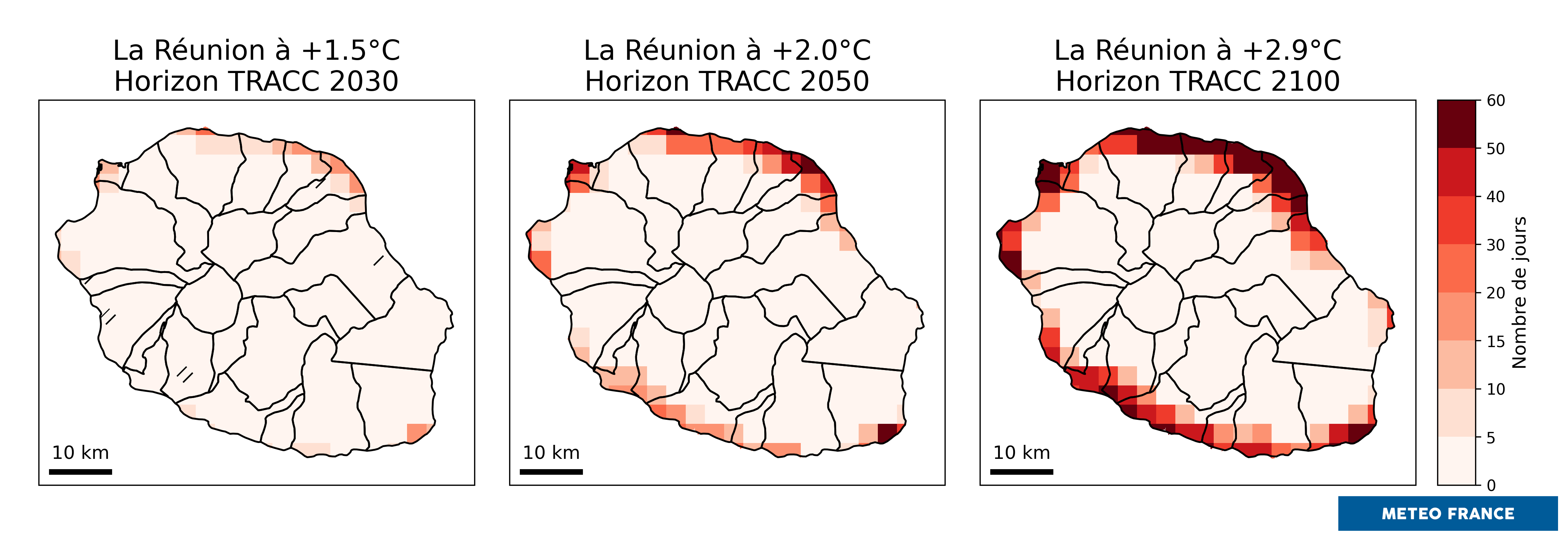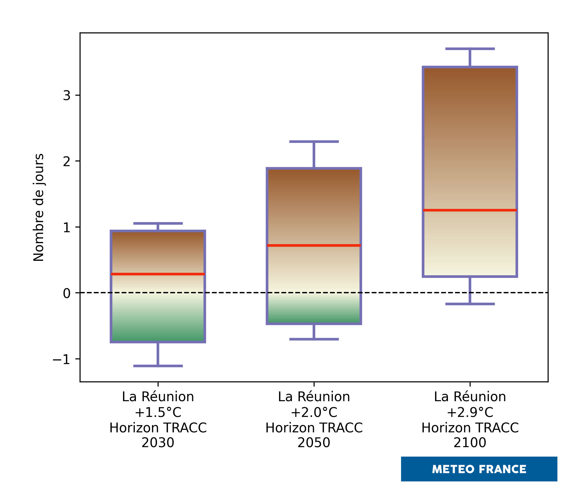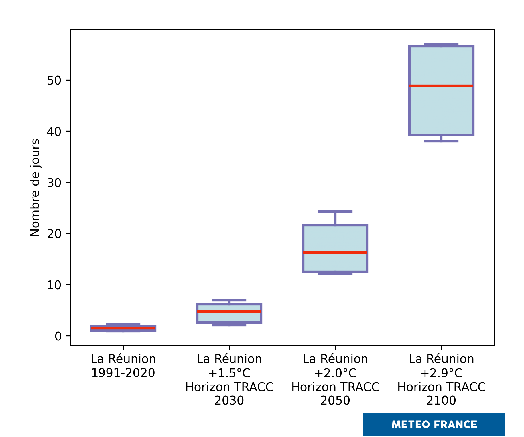 Températures extrêmes :Dans le passé récent 1991-2020, les jours chauds (températures maximales supérieures ou égales à 31°C) concernaient exclusivement les zones littorales une dizaine de jours par an (Figures 11, 12). Les jours chauds vont devenir plus fréquents à mesure que le climat se réchauffe et vont s’étendre sur les hauteurs de l’île (Figures 11, 13). Cette augmentation sera notable à 2°C (respectivement 2,9°C) de réchauffement sur une grande partie des zones littorales de l’île qui pourraient connaître une cinquantaine (respectivement ~90) de jours chauds en moyenne par an, avec une incertitude de 5 (respectivement 10) jours autour de cette valeur médiane (Figures 11, 13). Figure 11 : Distribution du nombre annuel de jours chauds (températures maximales supérieures ou égales à 31°C) sur l’île de La Réunion (médiane spatiale) dans l’ensemble Réunion SocleOM-Climat-2025, pour le climat récent 1991-2020 et pour les niveaux de réchauffement territoriaux associés aux horizons TRACC 2030, 2050 et 2100, respectivement. Figure 12 : Carte du nombre annuel de jours chauds (températures maximales supérieures ou égales à 31°C) sur la période 1991-2020 selon la médiane de l’ensemble Réunion SocleOM-Climat-2025 à la Réunion. Figure 13 : Evolution, par rapport au passé récent 1991-2020, du nombre annuel de jours chauds (températures maximales supérieures ou égales à 31°C) à La Réunion selon la médiane de l’ensemble Réunion SocleOM-Climat-2025 pour les niveaux de réchauffement territoriaux associés aux horizons TRACC 2030, 2050 et 2100, respectivement. Dans le passé récent 1991-2020, les nuits chaudes (températures minimales supérieures ou égales à 25°C) concernaient exclusivement les zones littorales une dizaine de jours par an (Figures 14, 15). Les nuits chaudes vont se multiplier à mesure que le réchauffement progressera mais aussi se propager vers les hauteurs de l’île (Figures 14, 16). Cette augmentation sera notable à 2°C (respectivement 2,9°C) de réchauffement sur une grande partie des zones littorales de l’île qui pourraient connaître une quinzaine (respectivement ~50) de nuits chaudes en moyenne par an, avec une incertitude d’environ 5 (respectivement 10) jours autour de cette valeur médiane (Figures 14, 16). Figure 14 : Distribution du nombre annuel de nuits chaudes (températures minimales supérieures ou égales à 25°C) sur l’île de La Réunion (médiane spatiale) dans l’ensemble Réunion SocleOM-Climat-2025, pour le climat récent 1991-2020 et pour les niveaux de réchauffement territoriaux associés aux horizons TRACC 2030, 2050 et 2100, respectivement. Figure 15 : Carte du nombre annuel de nuits chaudes (températures minimales supérieures ou égales à 25°C) sur la période 1991-2020 selon la médiane de l’ensemble Réunion SocleOM-Climat-2025 à la Réunion. Figure 16 : Evolution, par rapport au passé récent 1991-2020, du nombre annuel de nuits chaudes (températures minimales supérieures ou égales à 25°C) à La Réunion selon la médiane de l’ensemble Réunion SocleOM-Climat-2025 pour les niveaux de réchauffement territoriaux associés aux horizons TRACC 2030, 2050 et 2100, respectivement.
