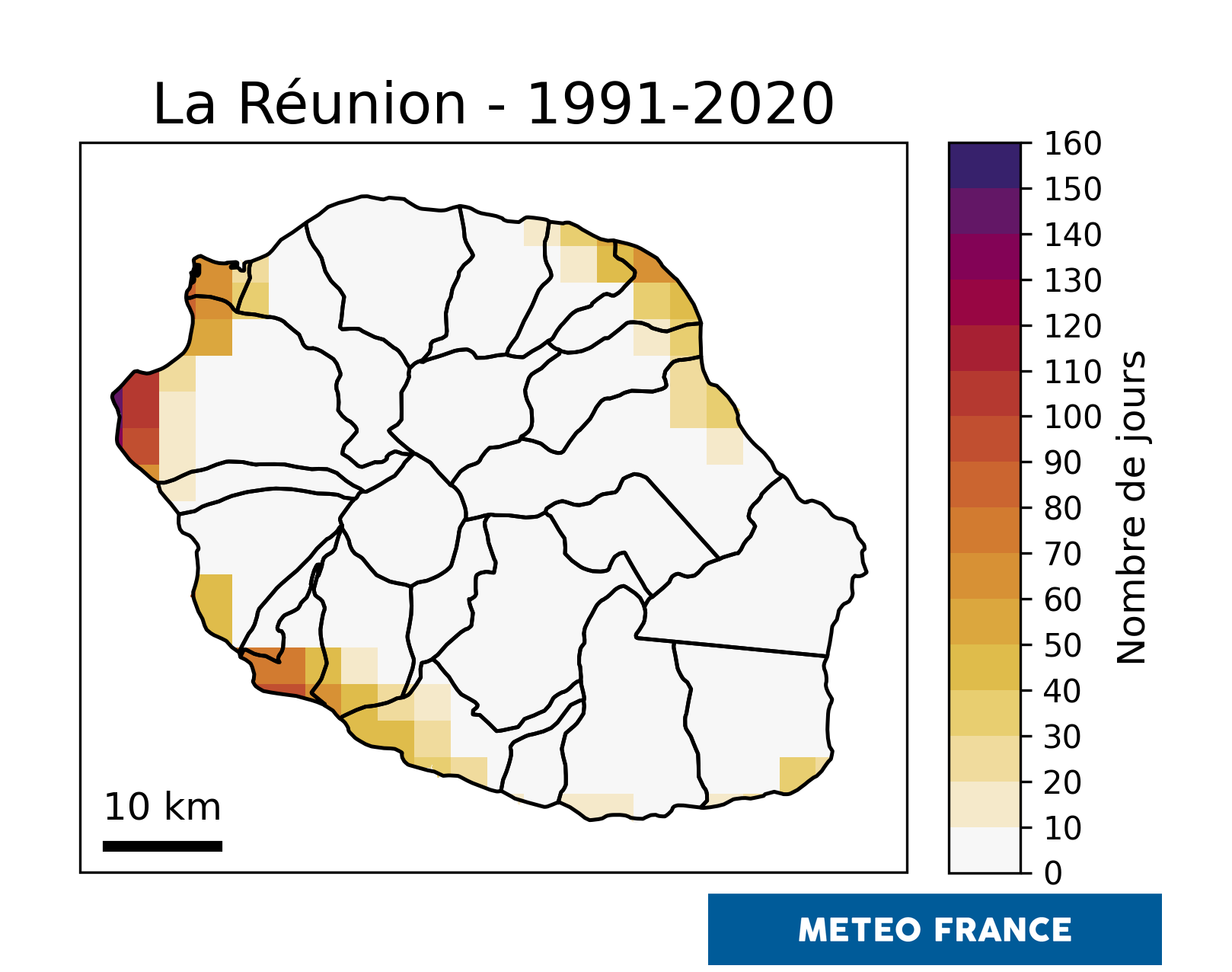 Période de référence Afin de refléter le climat actuel, la période de référence choisie pour le jeu de données Réunion SocleOM-climat-2025 est 1991-2020. Le réchauffement observé à La Réunion entre l’ère préindustrielle et la période 1991-2020 est estimé entre +0,8 °C et +0,9 °C.