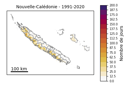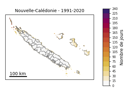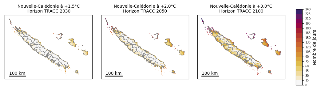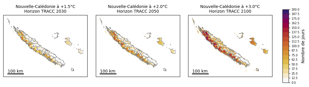 Tableau 1 : Ligne 1 : niveaux de réchauffement planétaire par rapport à la période préindustrielle 1850-1900. Lignes 2 et 3 : niveaux de réchauffement correspondants en Nouvelle-Calédonie par rapport aux périodes pré-industrielle et 1991-2020 L’année chaude exceptionnelle de 2024 (+0,5 °C par rapport à la référence 1991-2020), quatrième année la plus chaude depuis le début des mesures, deviendrait une année normale à l’horizon 2030 de la TRACC, tandis que l’année 2022, année la plus chaude (+1,2 °C), deviendrait la norme à l’horizon 2050 de la TRACC. Températures extrêmes :Dans le passé récent 1991-2020, les jours chauds (pour la Nouvelle-Calédonie : températures maximales supérieures ou égales à 32 °C) concernaient principalement les communes de la côte ouest et dans une moindre mesure l’île de Lifou (Figures 12, 13). À mesure que le climat calédonien se réchauffe, la fréquence des jours chauds augmente sur toutes les communes. Cette hausse est importante dès +1,5 °C : par rapport au climat récent le nombre moyen de jours chauds augmente de 50 % sur la côte ouest, 100 % sur la côte est et les Loyautés. La progression se fait de la côte sous le vent à la côte au vent, quelle que soit l’île considérée (Grande Terre, Lifou, Maré). A +3 °C, c’est quasiment tout le territoire calédonien qui connaît chaque année au moins une journée à plus de 32 °C, à l’exception notable des sommets (Monts Panié, Humboldt) qui restent épargnés par de tels niveaux de chaleur. Sur la côte ouest le seuil de 32 °C est par endroit dépassé la moitié de l’année. Figure 12 : Distribution du nombre annuel de jours chauds (températures maximales supérieures ou égales à 32 °C) en Nouvelle-Calédonie (médiane spatiale) dans l’ensemble Nouvelle-Calédonie_SocleOM-climat-2025, pour le climat récent 1991-2020 et pour les niveaux de réchauffement territoriaux associés aux horizons TRACC 2030, 2050 et 2100, respectivement. Figure 13 : Carte du nombre annuel de jours chauds (températures maximales supérieures ou égales à 32 °C) sur la période 1991-2020 selon la médiane de l’ensemble Nouvelle-Calédonie_SocleOM-climat-2025 en Nouvelle-Calédonie. Figure 14 : Cartes du nombre annuel de jours chauds (températures maximales supérieures ou égales à 32 °C) en Nouvelle-Calédonie selon la médiane de l’ensemble Nouvelle-Calédonie_SocleOM-climat-2025 pour les niveaux de réchauffement territoriaux associés aux horizons TRACC 2030, 2050 et 2100, respectivement. Dans le passé récent 1991-2020, les nuits chaudes (pour la Nouvelle-Calédonie : températures minimales supérieures ou égales à 24 °C) concernaient la pointe Nord de la Grande Terre, les îles Loyauté au premier rang desquelles Ouvéa, et dans une moindre mesure la frange littorale de la Grande Terre (Figures 15, 16). Avec le réchauffement, la fréquence des nuits chaudes augmente fortement. Sur le littoral de la Grande Terre, quand le climat se réchauffe de +1,5 °C, la fréquence des nuits chaudes double par rapport au climat passé. Figure 15 : Distribution du nombre annuel de nuits chaudes (températures minimales supérieures ou égales à 24 °C) en Nouvelle-Calédonie (médiane spatiale) dans l’ensemble Nouvelle-Calédonie_SocleOM-climat-2025, pour le climat récent 1991-2020 et pour les niveaux de réchauffement territoriaux associés aux horizons TRACC 2030, 2050 et 2100, respectivement.