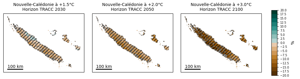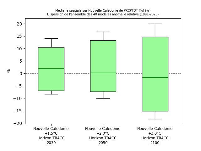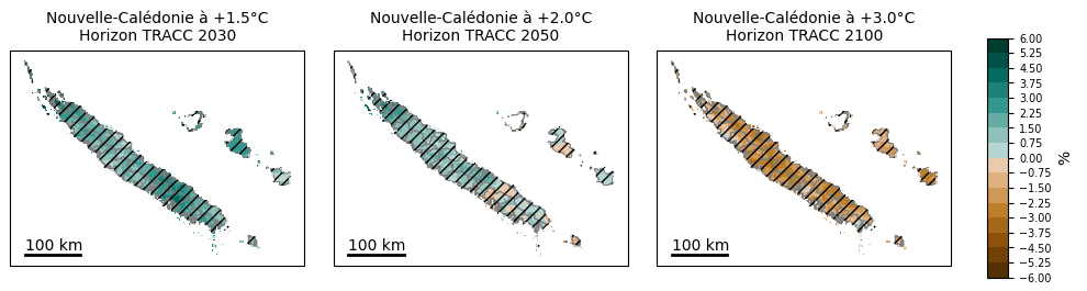 Précipitations moyennesLe cumul de pluies annuel (Figure 18) demeure proche de la valeur de référence 1991-2020 (évolution de la médiane spatiale <5 % en valeur absolue) quel que soit le niveau de réchauffement considéré. Qu’il s’agisse de la côte ouest de la Grande Terre, la moins arrosée, aux régions les plus humides comme les massifs montagneux du Panié ou du Humboldt, en passant par la côte est ou les Loyautés (Figure 19), il n’y a pas de tendance claire (figure 20). Aucune zone du territoire n’est soumise à une tendance qui fasse consensus entre les modèles. L’évolution des précipitations est marquée par des alternances entre des années et des décennies, plus pluvieuses qui succèdent à des périodes plus sèches, sans véritable tendance, ni à la hausse, ni à la baisse. Figure 18 : Distribution du cumul de précipitations annuel (en anomalie relative par rapport au passé récent 1991-2020, en %) en Nouvelle-Calédonie (médiane spatiale) dans l’ensemble Nouvelle-Calédonie_SocleOM-climat-2025 pour les niveaux de réchauffement territoriaux associés aux horizons TRACC 2030, 2050 et 2100, respectivement. Figure 19 : Carte du cumul annuel de précipitations sur la période 1991-2020 selon la médiane de l’ensemble Nouvelle-Calédonie_SocleOM-climat-2025 en Nouvelle-Calédonie. Figure 20 : Cartes du cumul annuel de précipitations (en anomalie relative par rapport au passé récent 1991-2020, en %) selon la médiane de l’ensemble Nouvelle-Calédonie_SocleOM-climat-2025 pour les niveaux de réchauffement territoriaux associés aux horizons TRACC 2030, 2050 et 2100, respectivement. Les hachures délimitent les zones où moins de 80 % de modèles sont en accord sur le signe de l’évolution.