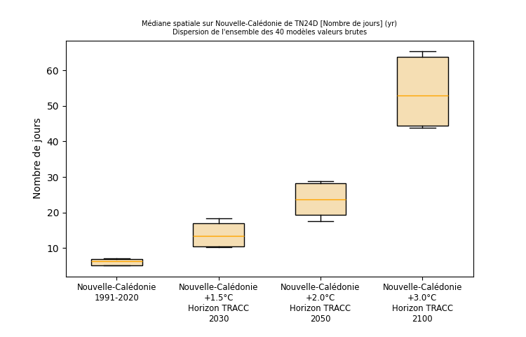 A 3,0 °C la fréquence des nuits chaudes est multipliée par 4, voire 5. On note aussi qu’avec le réchauffement le seuil de chaleur nocturne gagne petit à petit l’intérieur des terres, notamment sur la Grande Terre où seuls sont épargnés les points les plus hauts de la chaîne centrale. Figure 16 : Carte du nombre annuel de nuits chaudes (températures minimales supérieures ou égales à 24 °C) sur la période 1991-2020 selon la médiane de l’ensemble Nouvelle-Calédonie_SocleOM-climat-2025 en Nouvelle-Calédonie. Figure 17: Cartes du nombre annuel de nuits chaudes (températures minimales supérieures ou égales à 24 °C) en Nouvelle-Calédonie selon la médiane de l’ensemble Nouvelle-Calédonie_SocleOM-climat-2025 pour les niveaux de réchauffement territoriaux associés aux horizons TRACC 2030, 2050 et 2100, respectivement.