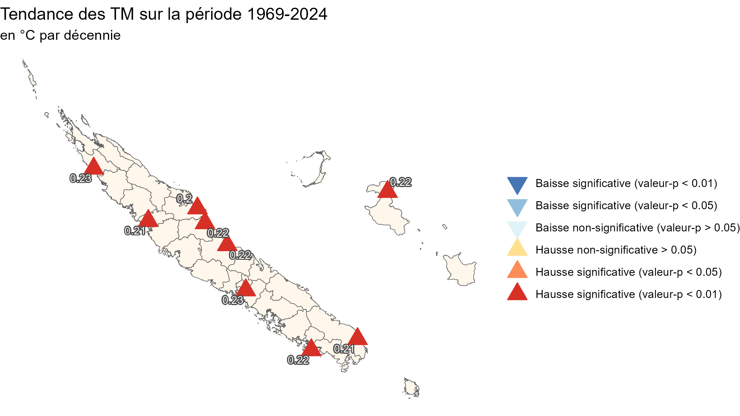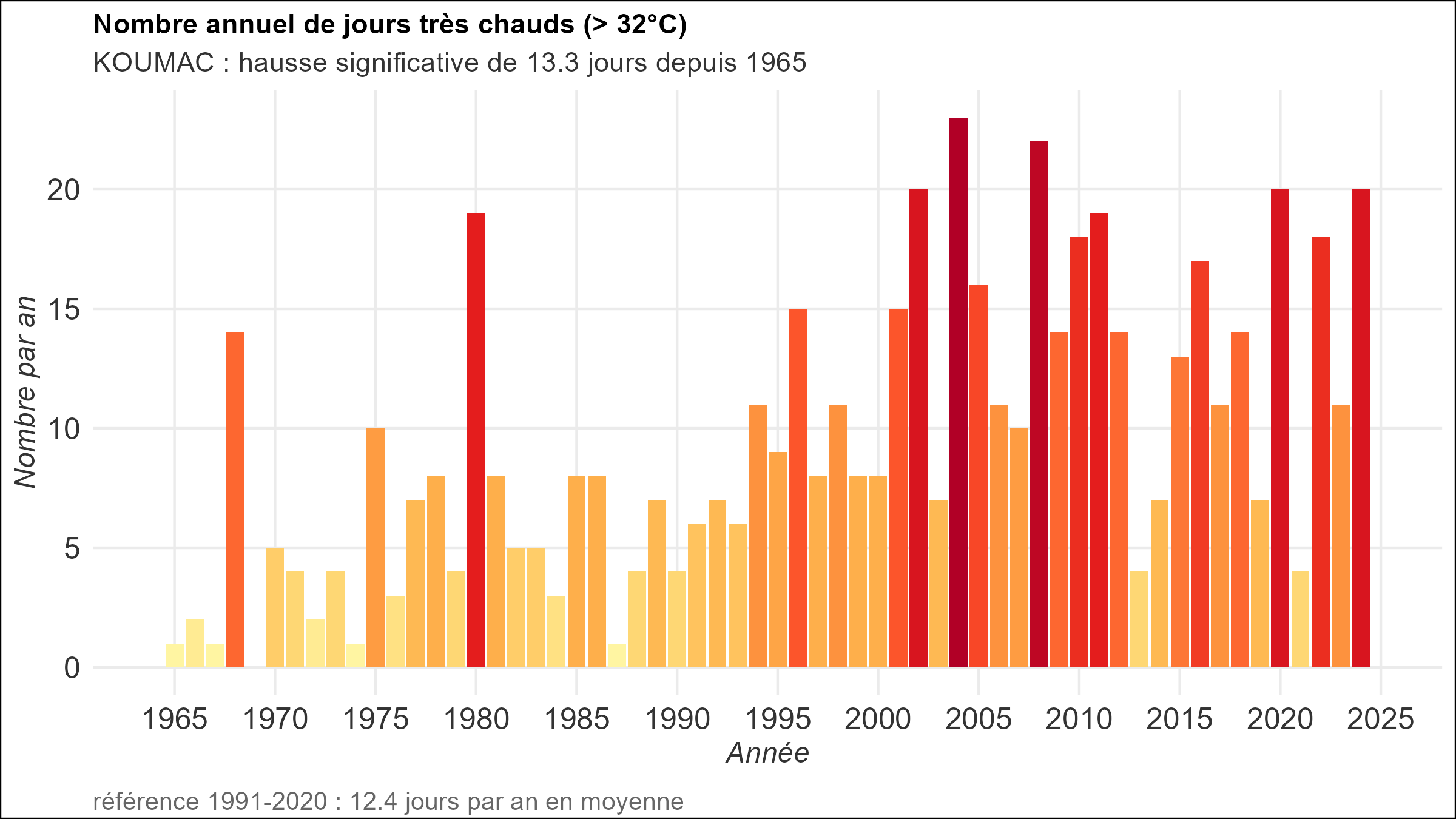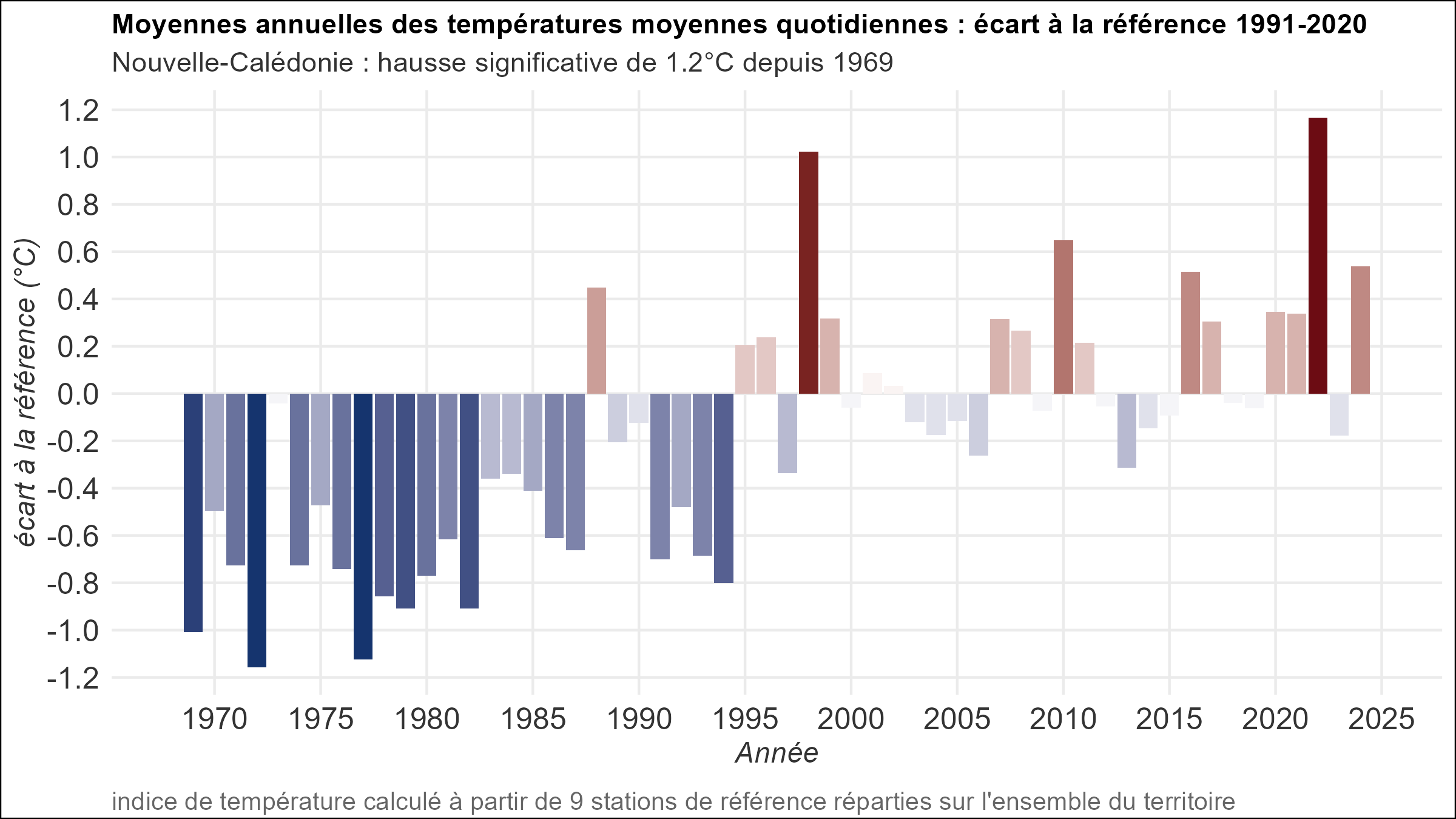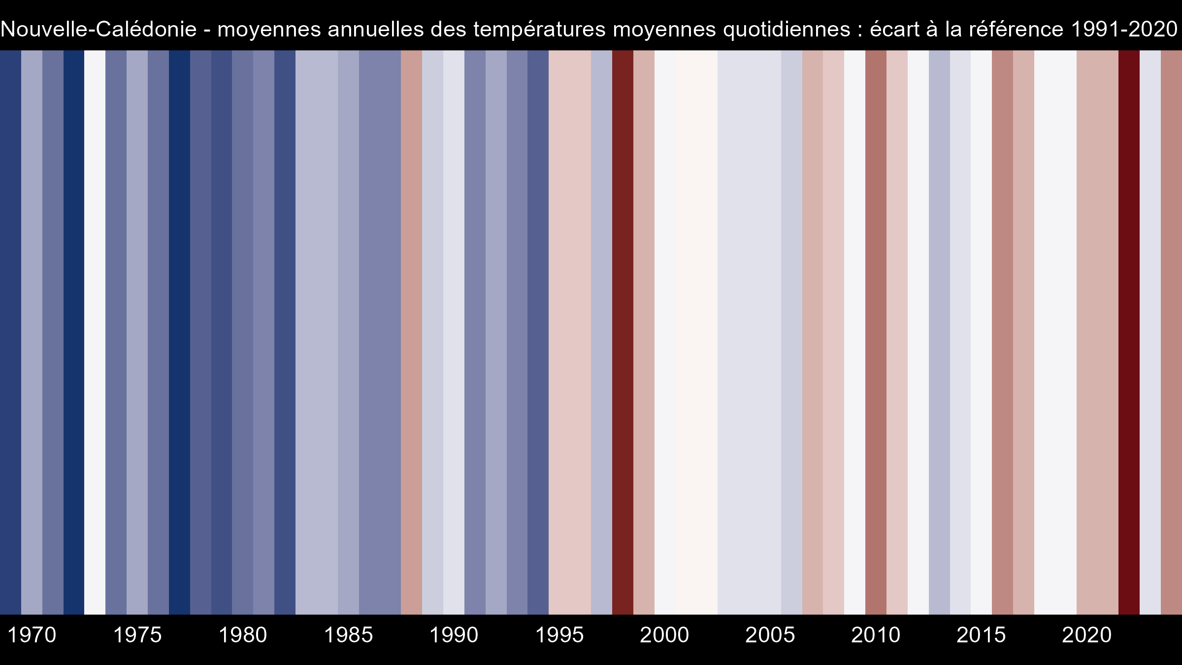 TempératuresEn Nouvelle-Calédonie, l’évolution de la température de l’air à 2 m est mesurée à partir des données issues de 9 stations de référence possédant des mesures homogénéisées depuis plus de 50 ans, réparties sur l’ensemble de la Grande Terre et les îles Loyauté (Figures 1 et 2). L’analyse de ces tendances révèle une hausse significative de +0,21 °C par décennie, soit +1,2 °C sur la période 1969-2024. La température moyenne des dix dernières années (2015-2024) est de 23,9°C, soit un écart de 0.3°C par rapport à la référence 1991-2020. Les trois années les plus chaudes sont 2022 (+1,2 °C), 1998 (+1,0 °C) et 2010 (+0,6 °C). Figure 1 : écart à la normale 1991-2020 de la température moyenne annuelle enregistrée en Nouvelle-Calédonie depuis 1969 (en °C). Figure 2 : Tendance par décennie de la moyenne annuelle des températures moyennes quotidiennes relevées en Nouvelle-Calédonie pour un ensemble de 9 stations depuis 1969. Les « bandes de réchauffement » (warming stripes en anglais) offrent une synthèse visuelle de ce réchauffement (Figure 3). Par rapport à la période de référence 1991-2020, la plupart des années anormalement « fraîches » (bandes bleues) se sont produites avant 1995. Figure 3 : « bandes de réchauffement » de la Nouvelle-Calédonie pour les 9 stations de référence L’augmentation de la température moyenne relevée en Nouvelle-Calédonie au cours des 5 dernières décennies est cohérente avec les résultats obtenus sur d’autres îles et territoires du Pacifique sud (McGree, 2019). D’autres indicateurs permettent de mettre en évidence les effets du réchauffement climatique en Nouvelle-Calédonie, comme le nombre de jours chauds, pour lesquels la température maximale excède 32 °C (Figure 4). Par exemple à Koumac ce nombre augmente notablement depuis 2000, passant de 5 jours en moyenne décennale à la fin des années 1970 à plus de 13 entre 2015 et 2024. Figure 4 : Nombre moyen annuel de jours chauds (température maximale supérieure ou égale à 32 °C) à Koumac depuis 1965.