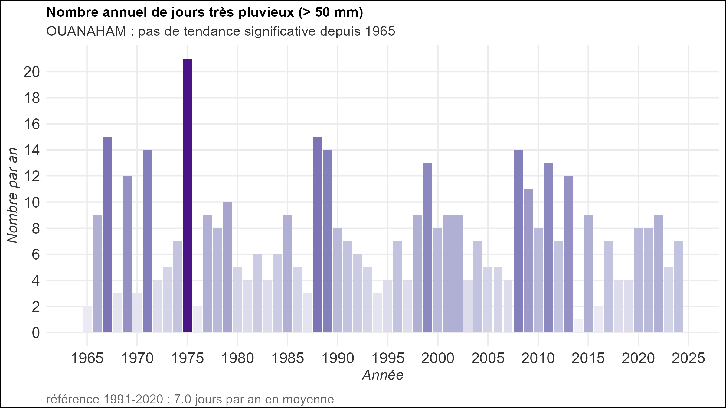 Précipitations extrêmesLes journées très pluvieuses (> 50 mm) sont fréquentes en Nouvelle-Calédonie et peuvent survenir été comme hiver. Leur fréquence au fil des ans est très variable comme l’illustre leur occurrence à l’aérodrome de Ouanaham sur l’île de Lifou (Figure 9). Aucune tendance significative n’est mise en évidence concernant l’occurrence des épisodes de fortes pluies en Nouvelle-Calédonie. Figure 9 : Nombre de jours où les pluies quotidiennes dépassent le seuil 50 mm à Ouanaham (commune de Lifou) depuis 1965.