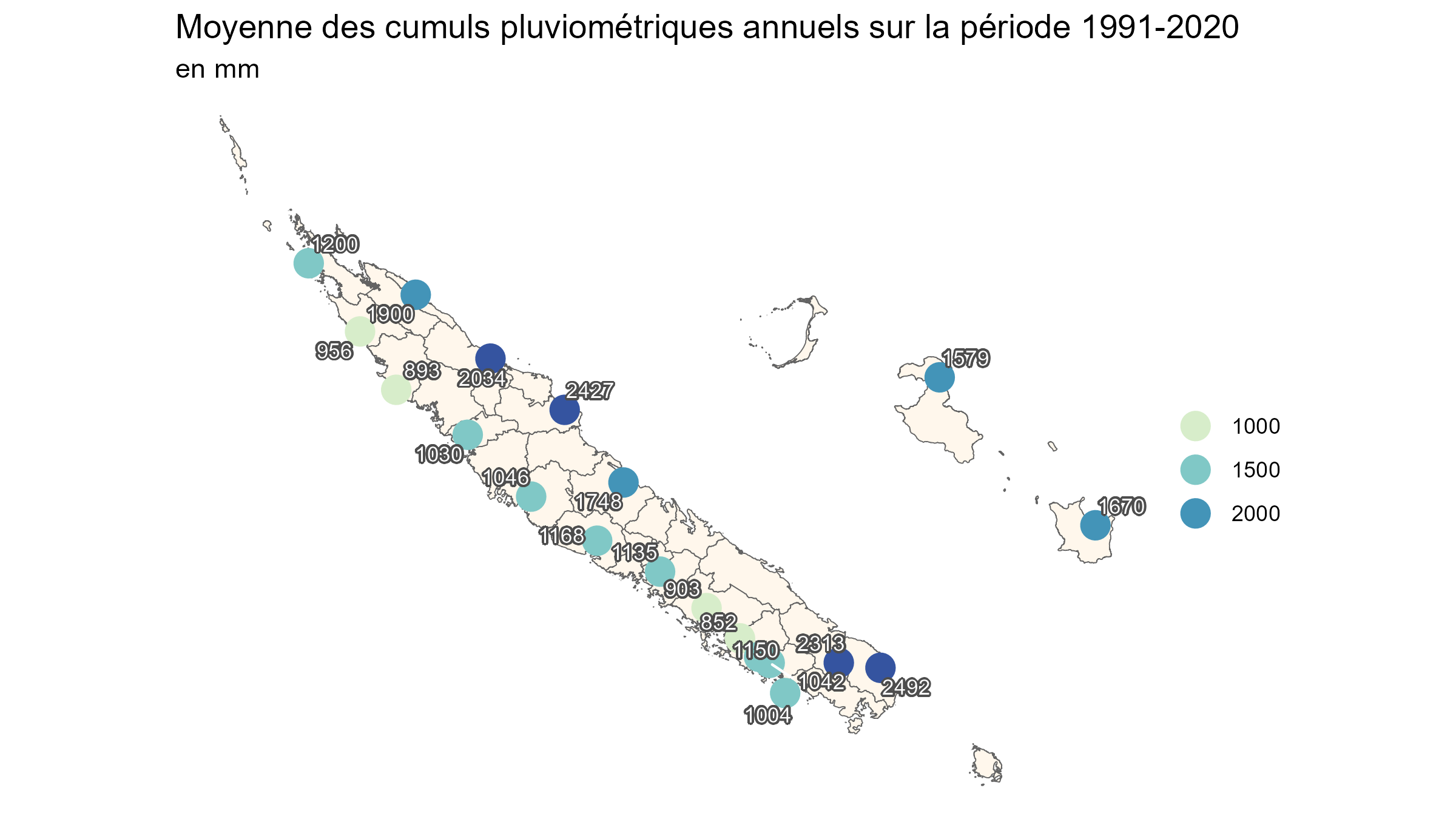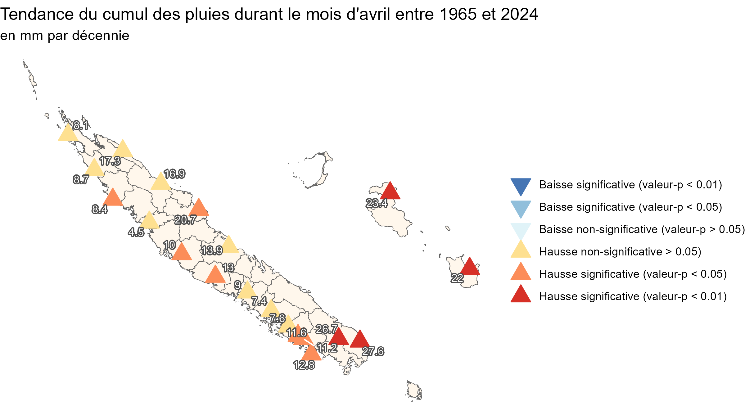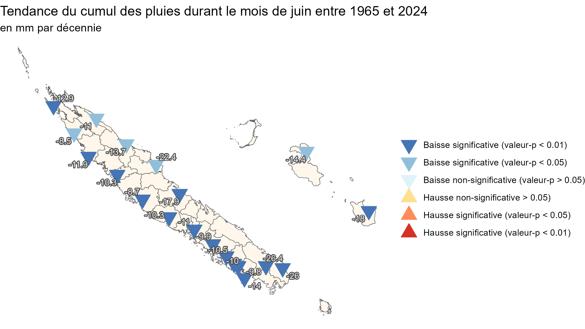 PrécipitationsEn saison chaude et pluvieuse les précipitations sont largement influencées par la position de la Zone de Convergence du Pacifique Sud. La totalité du territoire peut être concernée par un épisode pluvio-orageux généralisé, avec des cumuls qui dépassent par endroit 100 mm en 24 heures. Durant la saison sèche les pluies sont par endroits inexistantes, notamment sur la côte ouest de la Grande Terre. Qu’il s’agisse des pluies éparses apportées par un flux d’alizé humide ou des pluies à caractère orageux d’origine tropicale, les quantités d’eau déversées sont modulées par le relief (Figure 5): les îles Loyauté, la côte est et la pointe Sud de la Grande Terre sont plus arrosées que les plaines de la côte ouest. Pendant la saison fraîche, le quart sud-ouest de la Grande Terre, la pointe Sud et l’île de Maré connaissent un regain d’activité pluvieuse en raison des perturbations australes qui circulent d’ouest en est sur la Mer de Tasman. Figure 5 : Valeurs moyennes sur la période 1991-2020 des pluies annuelles relevées sur la Nouvelle-Calédonie pour un ensemble de 20 stations de référence. L’évolution du cumul annuel de précipitations sur 20 stations météorologiques possédant des données homogénéisées et sans manque depuis 1965 montre une forte variabilité inter-annuelle et décennale de la pluviométrie, sans tendance claire à ce jour (Figure 6). Figure 6 : Écart à la référence moyenne 1991-2020 (en %) de l’indice annuel des précipitations calculé à partir de 20 stations de référence réparties sur l’ensemble du territoire. À l’échelle mensuelle, seuls les cumuls enregistrés en avril et en juin présentent un changement significatif sur le long terme depuis 1965. Sur l’ensemble de la Grande Terre et des îles, les quantités de pluies relevées en juin diminuent au fil des décennies (Figure 7). La tendance est significative pour les 20 postes pluviométriques. En moyenne, la baisse vaut 14 mm/décennie, ce qui équivaut par décennie à 15 % de la quantité habituellement mesurée. Ce résultat est cohérent avec la baisse des pluies déjà mise en évidence dans les îles subtropicales du Pacifique sud-ouest (îles Lord Howe, Norlfolk et Raoul) (McGree, 2019) Figure 7 : Tendance par décennie du cumul des pluies enregistré en juin en Nouvelle-Calédonie pour un ensemble de 20 stations depuis 1965. Les cumuls mesurés en avril ont tendance à augmenter au fil des décennies (Figure 8). Pour la moitié des stations, on estime cependant que l’augmentation n’est pas significative*. Là où la tendance se distingue des variations d’une année à l’autre, la hausse s’échelonne entre 8 et 28 mm par décennie, ce qui équivaut à 10 % du cumul mensuel moyen. Figure 8 : Tendance par décennie depuis 1965 du cumul des pluies enregistrés en avril en Nouvelle-Calédonie pour un ensemble de 20 stations. À l’échelle saisonnière, qu’il s’agisse de la saison chaude et pluvieuse (janvier-février-mars), de la saison fraîche (juillet-août) ou de la saison sèche (septembre-octobre), les séries de données ne mettent en évidence aucune tendance significative. *L’absence de significativité statistique ne veut pas dire qu’il n’y a aucune tendance réelle ; cela peut signifier que si la tendance existe, elle ne peut pas être distinguée de la variabilité d’une année à l’autre, parce que les variations interannuelles sont grandes par rapport à la tendance et/ou parce que la série de données n’est pas encore suffisamment longue.