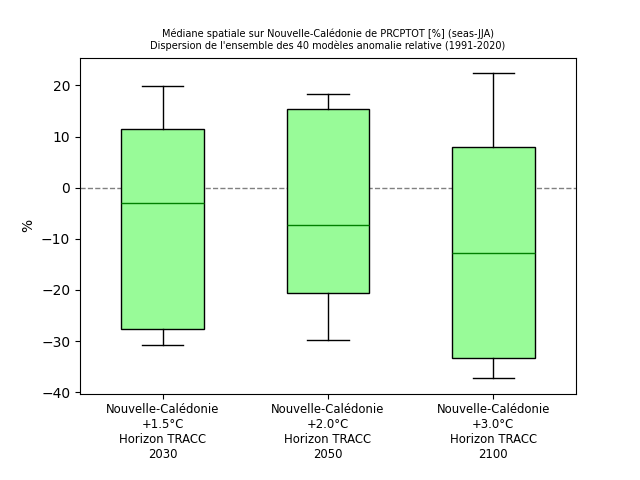 Précipitations moyennesLe cumul de pluies annuel (Figure 18) demeure proche de la valeur de référence 1991-2020 (évolution de la médiane spatiale <5 % en valeur absolue) quel que soit le niveau de réchauffement considéré. Qu’il s’agisse de la côte ouest de la Grande Terre, la moins arrosée, aux régions les plus humides comme les massifs montagneux du Panié ou du Humboldt, en passant par la côte est ou les Loyautés (Figure 19), il n’y a pas de tendance claire (figure 20). Aucune zone du territoire n’est soumise à une tendance qui fasse consensus entre les modèles. L’évolution des précipitations est marquée par des alternances entre des années et des décennies, plus pluvieuses qui succèdent à des périodes plus sèches, sans véritable tendance, ni à la hausse, ni à la baisse. Figure 18 : Distribution du cumul de précipitations annuel (en anomalie relative par rapport au passé récent 1991-2020, en %) en Nouvelle-Calédonie (médiane spatiale) dans l’ensemble Nouvelle-Calédonie_SocleOM-climat-2025 pour les niveaux de réchauffement territoriaux associés aux horizons TRACC 2030, 2050 et 2100, respectivement. Figure 19 : Carte du cumul annuel de précipitations sur la période 1991-2020 selon la médiane de l’ensemble Nouvelle-Calédonie_SocleOM-climat-2025 en Nouvelle-Calédonie. Figure 20 : Cartes du cumul annuel de précipitations (en anomalie relative par rapport au passé récent 1991-2020, en %) selon la médiane de l’ensemble Nouvelle-Calédonie_SocleOM-climat-2025 pour les niveaux de réchauffement territoriaux associés aux horizons TRACC 2030, 2050 et 2100, respectivement. Les hachures délimitent les zones où moins de 80 % de modèles sont en accord sur le signe de l’évolution.