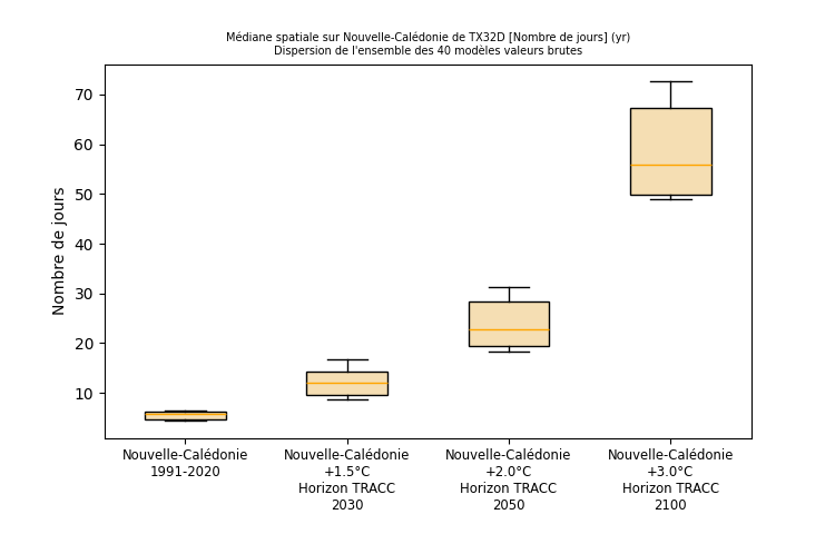 Tableau 1 : Ligne 1 : niveaux de réchauffement planétaire par rapport à la période préindustrielle 1850-1900. Lignes 2 et 3 : niveaux de réchauffement correspondants en Nouvelle-Calédonie par rapport aux périodes pré-industrielle et 1991-2020 L’année chaude exceptionnelle de 2024 (+0,5 °C par rapport à la référence 1991-2020), quatrième année la plus chaude depuis le début des mesures, deviendrait une année normale à l’horizon 2030 de la TRACC, tandis que l’année 2022, année la plus chaude (+1,2 °C), deviendrait la norme à l’horizon 2050 de la TRACC. Températures extrêmes :Dans le passé récent 1991-2020, les jours chauds (pour la Nouvelle-Calédonie : températures maximales supérieures ou égales à 32 °C) concernaient principalement les communes de la côte ouest et dans une moindre mesure l’île de Lifou (Figures 12, 13). À mesure que le climat calédonien se réchauffe, la fréquence des jours chauds augmente sur toutes les communes. Cette hausse est importante dès +1,5 °C : par rapport au climat récent le nombre moyen de jours chauds augmente de 50 % sur la côte ouest, 100 % sur la côte est et les Loyautés. La progression se fait de la côte sous le vent à la côte au vent, quelle que soit l’île considérée (Grande Terre, Lifou, Maré). A +3 °C, c’est quasiment tout le territoire calédonien qui connaît chaque année au moins une journée à plus de 32 °C, à l’exception notable des sommets (Monts Panié, Humboldt) qui restent épargnés par de tels niveaux de chaleur. Sur la côte ouest le seuil de 32 °C est par endroit dépassé la moitié de l’année. Figure 12 : Distribution du nombre annuel de jours chauds (températures maximales supérieures ou égales à 32 °C) en Nouvelle-Calédonie (médiane spatiale) dans l’ensemble Nouvelle-Calédonie_SocleOM-climat-2025, pour le climat récent 1991-2020 et pour les niveaux de réchauffement territoriaux associés aux horizons TRACC 2030, 2050 et 2100, respectivement. Figure 13 : Carte du nombre annuel de jours chauds (températures maximales supérieures ou égales à 32 °C) sur la période 1991-2020 selon la médiane de l’ensemble Nouvelle-Calédonie_SocleOM-climat-2025 en Nouvelle-Calédonie. Figure 14 : Cartes du nombre annuel de jours chauds (températures maximales supérieures ou égales à 32 °C) en Nouvelle-Calédonie selon la médiane de l’ensemble Nouvelle-Calédonie_SocleOM-climat-2025 pour les niveaux de réchauffement territoriaux associés aux horizons TRACC 2030, 2050 et 2100, respectivement. Dans le passé récent 1991-2020, les nuits chaudes (pour la Nouvelle-Calédonie : températures minimales supérieures ou égales à 24 °C) concernaient la pointe Nord de la Grande Terre, les îles Loyauté au premier rang desquelles Ouvéa, et dans une moindre mesure la frange littorale de la Grande Terre (Figures 15, 16). Avec le réchauffement, la fréquence des nuits chaudes augmente fortement. Sur le littoral de la Grande Terre, quand le climat se réchauffe de +1,5 °C, la fréquence des nuits chaudes double par rapport au climat passé. Figure 15 : Distribution du nombre annuel de nuits chaudes (températures minimales supérieures ou égales à 24 °C) en Nouvelle-Calédonie (médiane spatiale) dans l’ensemble Nouvelle-Calédonie_SocleOM-climat-2025, pour le climat récent 1991-2020 et pour les niveaux de réchauffement territoriaux associés aux horizons TRACC 2030, 2050 et 2100, respectivement.