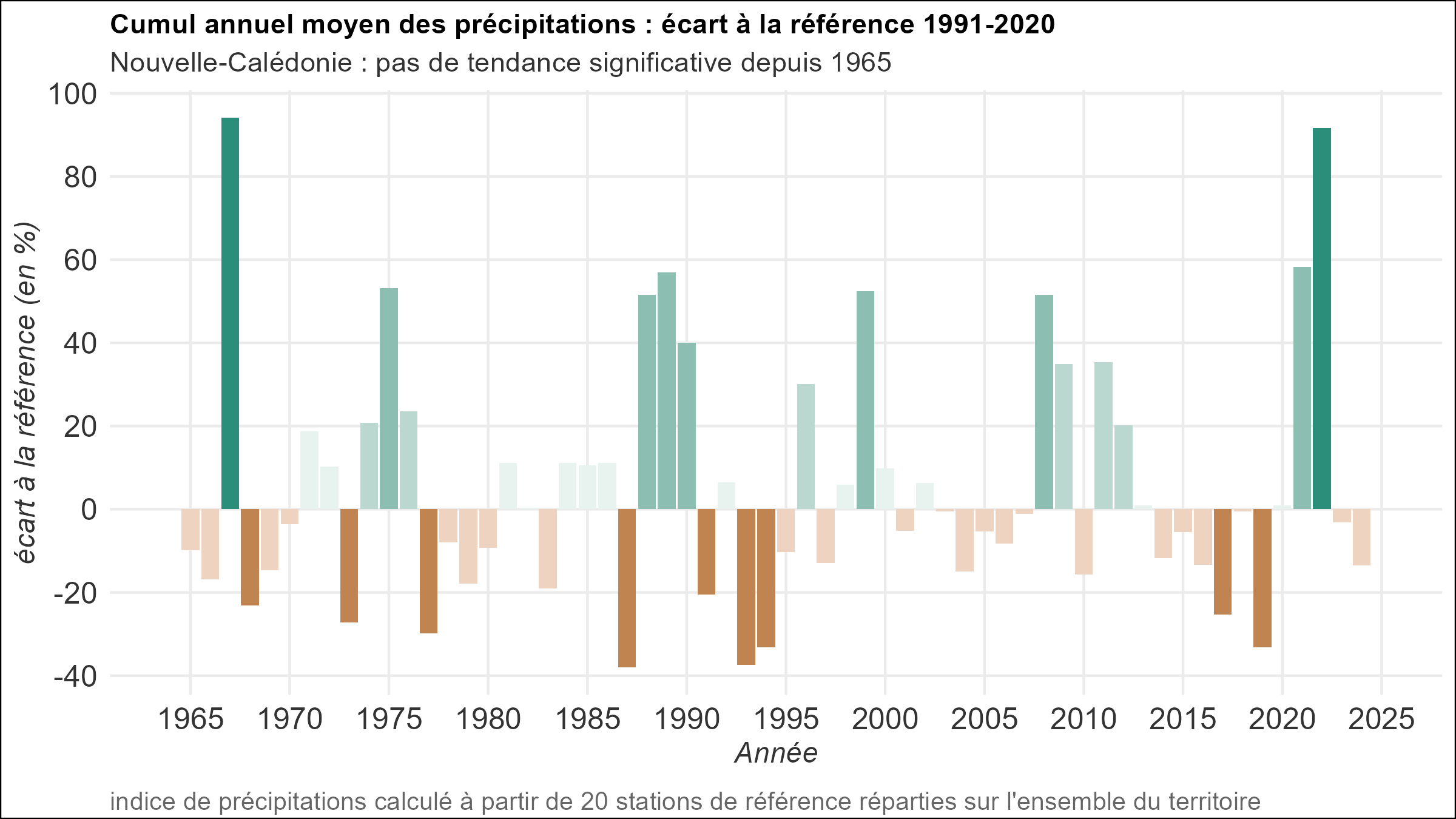 PrécipitationsEn saison chaude et pluvieuse les précipitations sont largement influencées par la position de la Zone de Convergence du Pacifique Sud. La totalité du territoire peut être concernée par un épisode pluvio-orageux généralisé, avec des cumuls qui dépassent par endroit 100 mm en 24 heures. Durant la saison sèche les pluies sont par endroits inexistantes, notamment sur la côte ouest de la Grande Terre. Qu’il s’agisse des pluies éparses apportées par un flux d’alizé humide ou des pluies à caractère orageux d’origine tropicale, les quantités d’eau déversées sont modulées par le relief (Figure 5): les îles Loyauté, la côte est et la pointe Sud de la Grande Terre sont plus arrosées que les plaines de la côte ouest. Pendant la saison fraîche, le quart sud-ouest de la Grande Terre, la pointe Sud et l’île de Maré connaissent un regain d’activité pluvieuse en raison des perturbations australes qui circulent d’ouest en est sur la Mer de Tasman. Figure 5 : Valeurs moyennes sur la période 1991-2020 des pluies annuelles relevées sur la Nouvelle-Calédonie pour un ensemble de 20 stations de référence. L’évolution du cumul annuel de précipitations sur 20 stations météorologiques possédant des données homogénéisées et sans manque depuis 1965 montre une forte variabilité inter-annuelle et décennale de la pluviométrie, sans tendance claire à ce jour (Figure 6). Figure 6 : Écart à la référence moyenne 1991-2020 (en %) de l’indice annuel des précipitations calculé à partir de 20 stations de référence réparties sur l’ensemble du territoire. À l’échelle mensuelle, seuls les cumuls enregistrés en avril et en juin présentent un changement significatif sur le long terme depuis 1965. Sur l’ensemble de la Grande Terre et des îles, les quantités de pluies relevées en juin diminuent au fil des décennies (Figure 7). La tendance est significative pour les 20 postes pluviométriques. En moyenne, la baisse vaut 14 mm/décennie, ce qui équivaut par décennie à 15 % de la quantité habituellement mesurée. Ce résultat est cohérent avec la baisse des pluies déjà mise en évidence dans les îles subtropicales du Pacifique sud-ouest (îles Lord Howe, Norlfolk et Raoul) (McGree, 2019) Figure 7 : Tendance par décennie du cumul des pluies enregistré en juin en Nouvelle-Calédonie pour un ensemble de 20 stations depuis 1965. Les cumuls mesurés en avril ont tendance à augmenter au fil des décennies (Figure 8). Pour la moitié des stations, on estime cependant que l’augmentation n’est pas significative*. Là où la tendance se distingue des variations d’une année à l’autre, la hausse s’échelonne entre 8 et 28 mm par décennie, ce qui équivaut à 10 % du cumul mensuel moyen. Figure 8 : Tendance par décennie depuis 1965 du cumul des pluies enregistrés en avril en Nouvelle-Calédonie pour un ensemble de 20 stations. À l’échelle saisonnière, qu’il s’agisse de la saison chaude et pluvieuse (janvier-février-mars), de la saison fraîche (juillet-août) ou de la saison sèche (septembre-octobre), les séries de données ne mettent en évidence aucune tendance significative. *L’absence de significativité statistique ne veut pas dire qu’il n’y a aucune tendance réelle ; cela peut signifier que si la tendance existe, elle ne peut pas être distinguée de la variabilité d’une année à l’autre, parce que les variations interannuelles sont grandes par rapport à la tendance et/ou parce que la série de données n’est pas encore suffisamment longue.