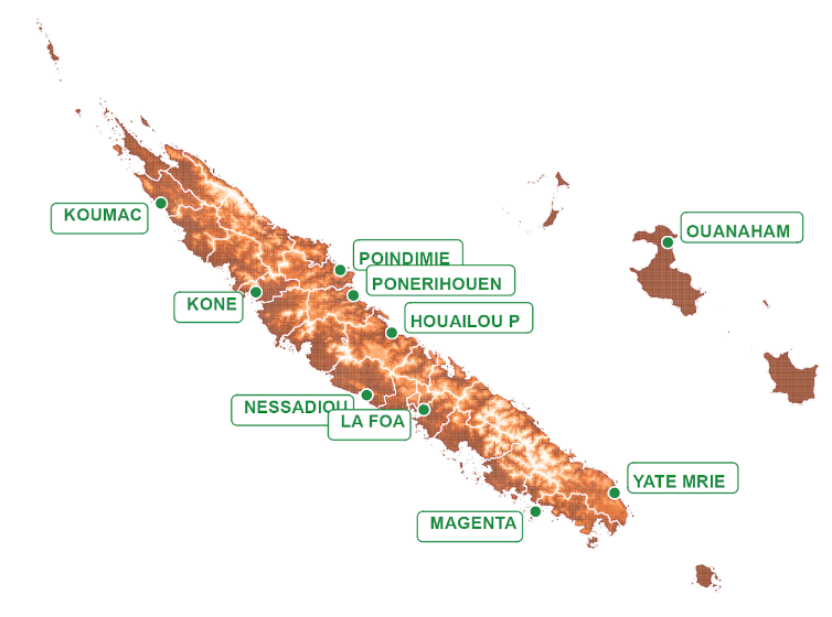 Figure 1 : Carte des 10 stations sélectionnées pour déterminer l’évolution observée de la température moyenne annuelle de la Nouvelle-Calédonie.