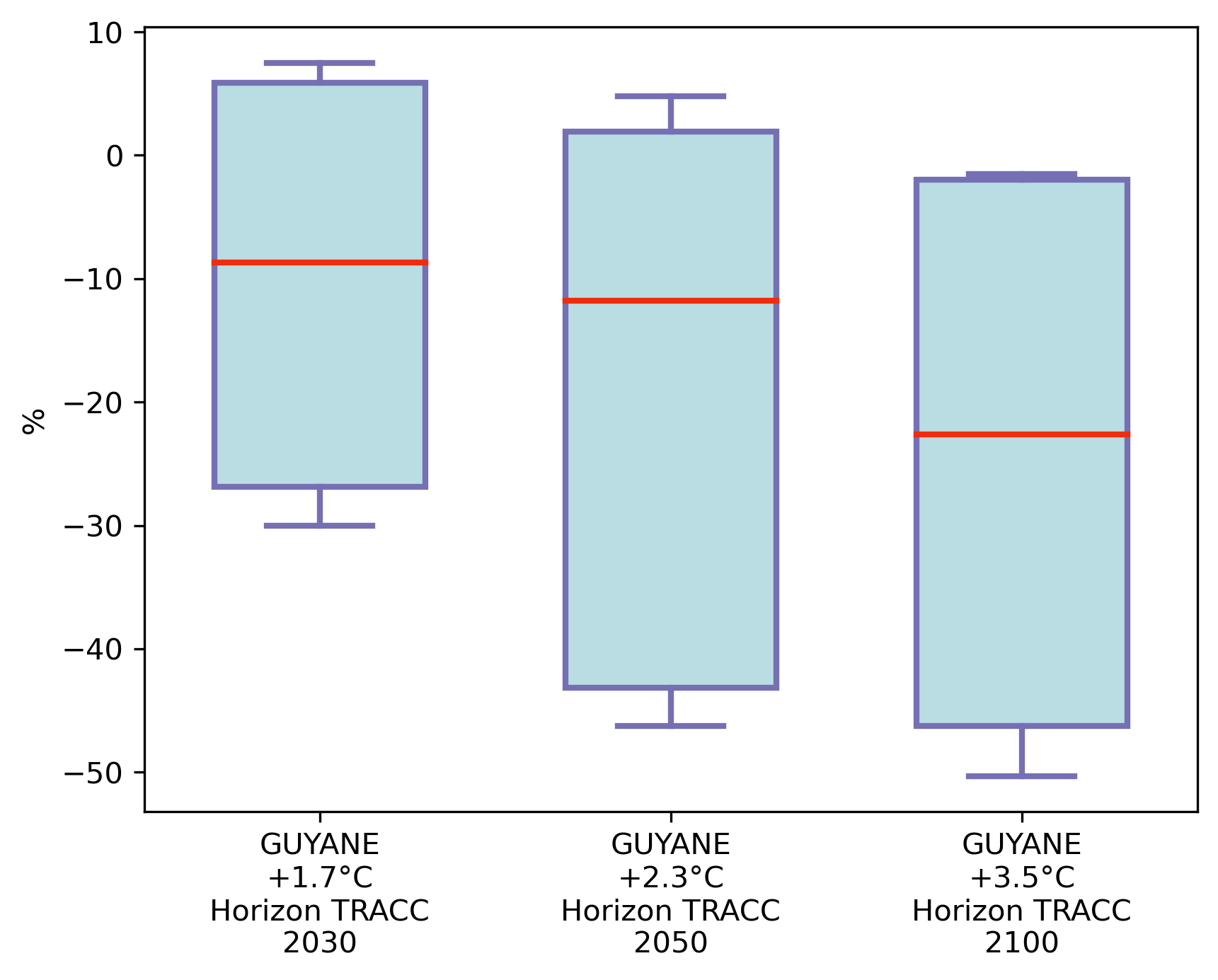 Figure 16 : Distribution de l’évolution du cumul de précipitations annuel (en anomalie relative par rapport au passé récent 1991-2020, en %) en Guyane (médiane spatiale) dans l’ensemble Guyane SocleOM-climat-2025 pour les niveaux de réchauffement territoriaux associés aux horizons TRACC 2030, 2050 et 2100, respectivement.