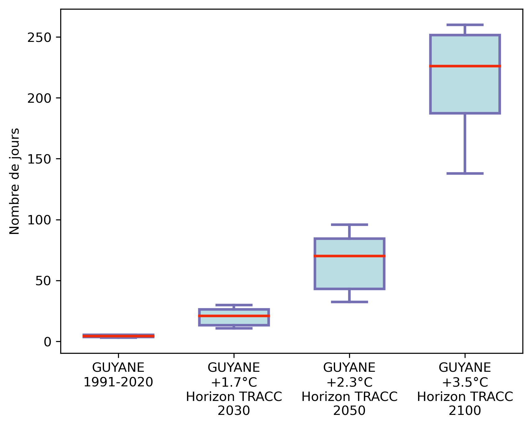 Figure 10 : Distribution du nombre annuel de jours chauds (températures maximales supérieures ou égales à 35°C) en Guyane (médiane spatiale) dans l’ensemble Guyane SocleOM-climat-2025, pour le climat récent 1991-2020 et pour les niveaux de réchauffement territoriaux associés aux horizons TRACC 2030, 2050 et 2100, respectivement.