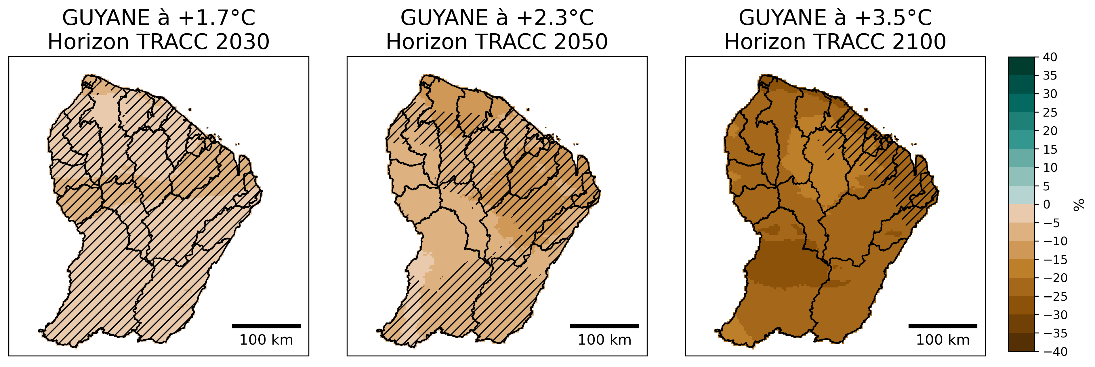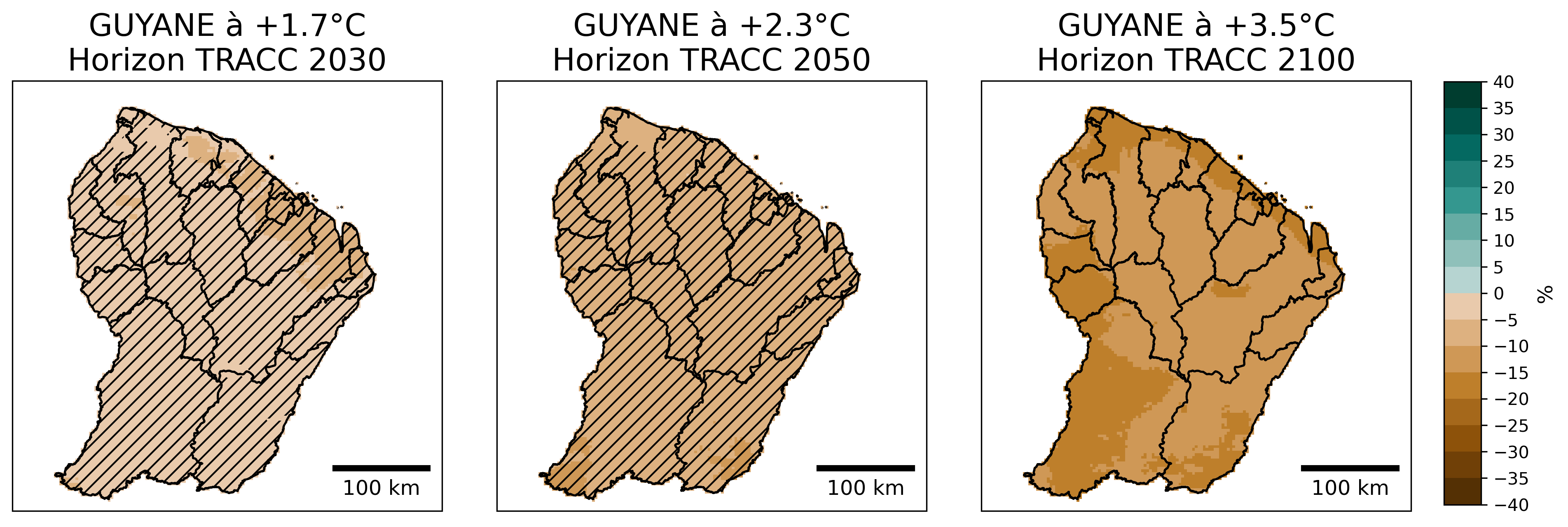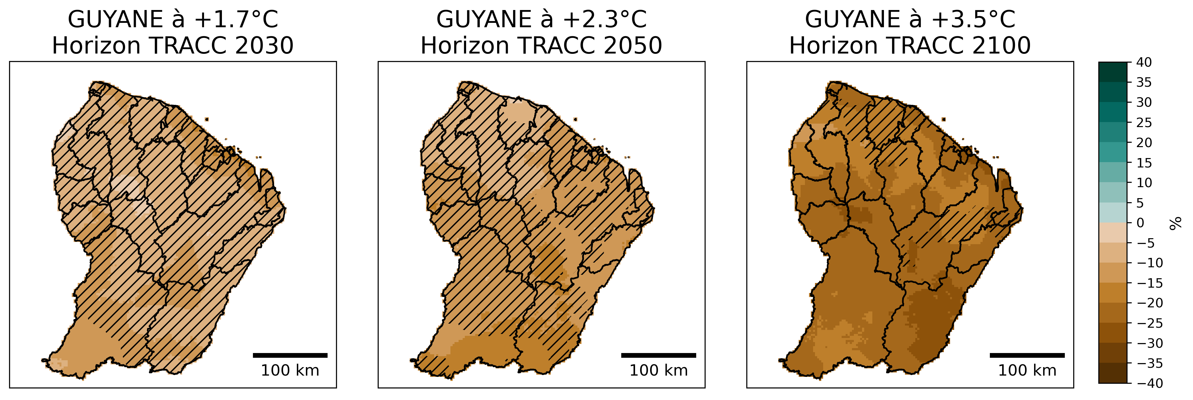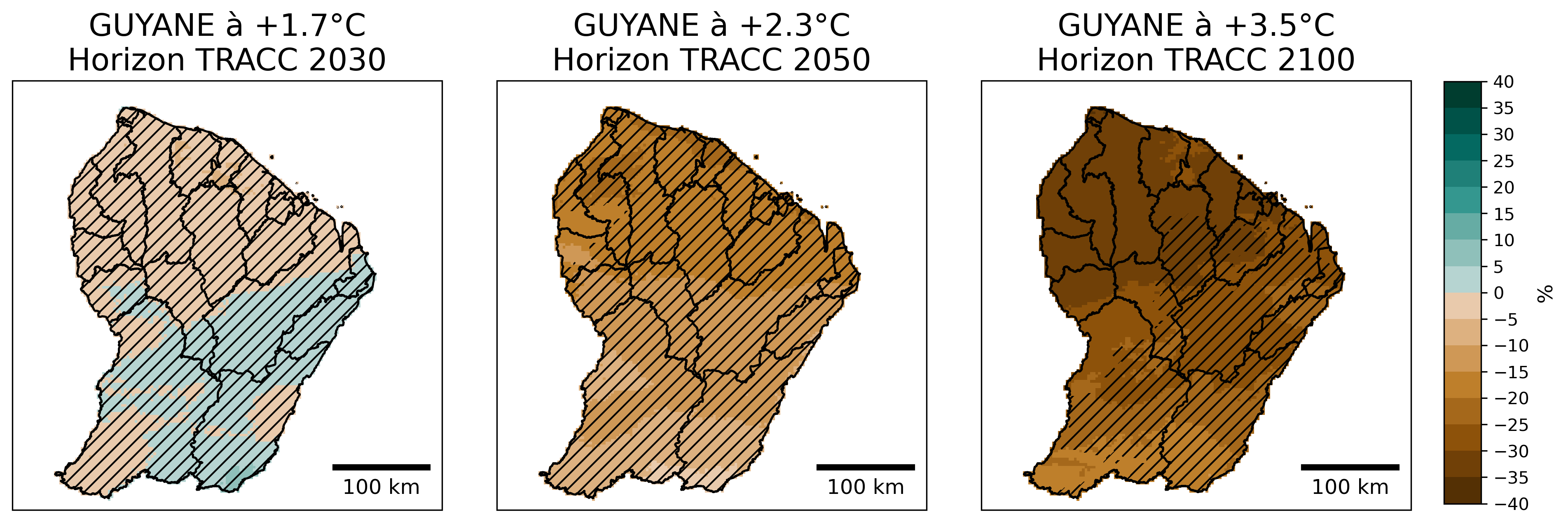 Figure 18 : Evolution du cumul annuel de précipitations (en anomalie relative par rapport au passé récent 1991-2020, en %) selon la médiane de l’ensemble Guyane SocleOM-climat-2025 pour les niveaux de réchauffement territoriaux associés aux horizons TRACC 2030, 2050 et 2100, respectivement. Les hachures délimitent les zones où moins de 80 % de modèles sont en accord sur le signe de l’évolution.