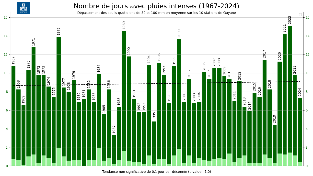 Figure 7 : Nombre de jours où les pluies quotidiennes dépassent les seuils 50 mm (vert foncé) ou 100 mm (vert clair) en Guyane depuis le début des observations. La tendance linéaire sur le seuil 50 mm figure en pointillés.