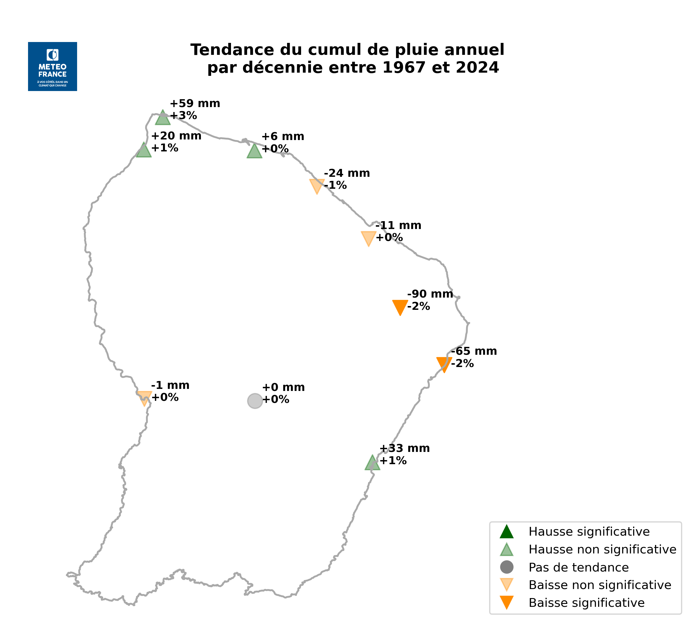 La carte ci-dessous montre la tendance (en pourcentage par décennie) sur le cumul annuel des précipitations depuis 1967 (Figure 5). Si la plupart des stations indiquent une tendance à la baisse, seule la région du Nord-Est continental subit une évolution statistiquement significative de −2 % par décennie. Sur les autres régions, on observe des tendances non significatives au regard de la variabilité propre des précipitations.