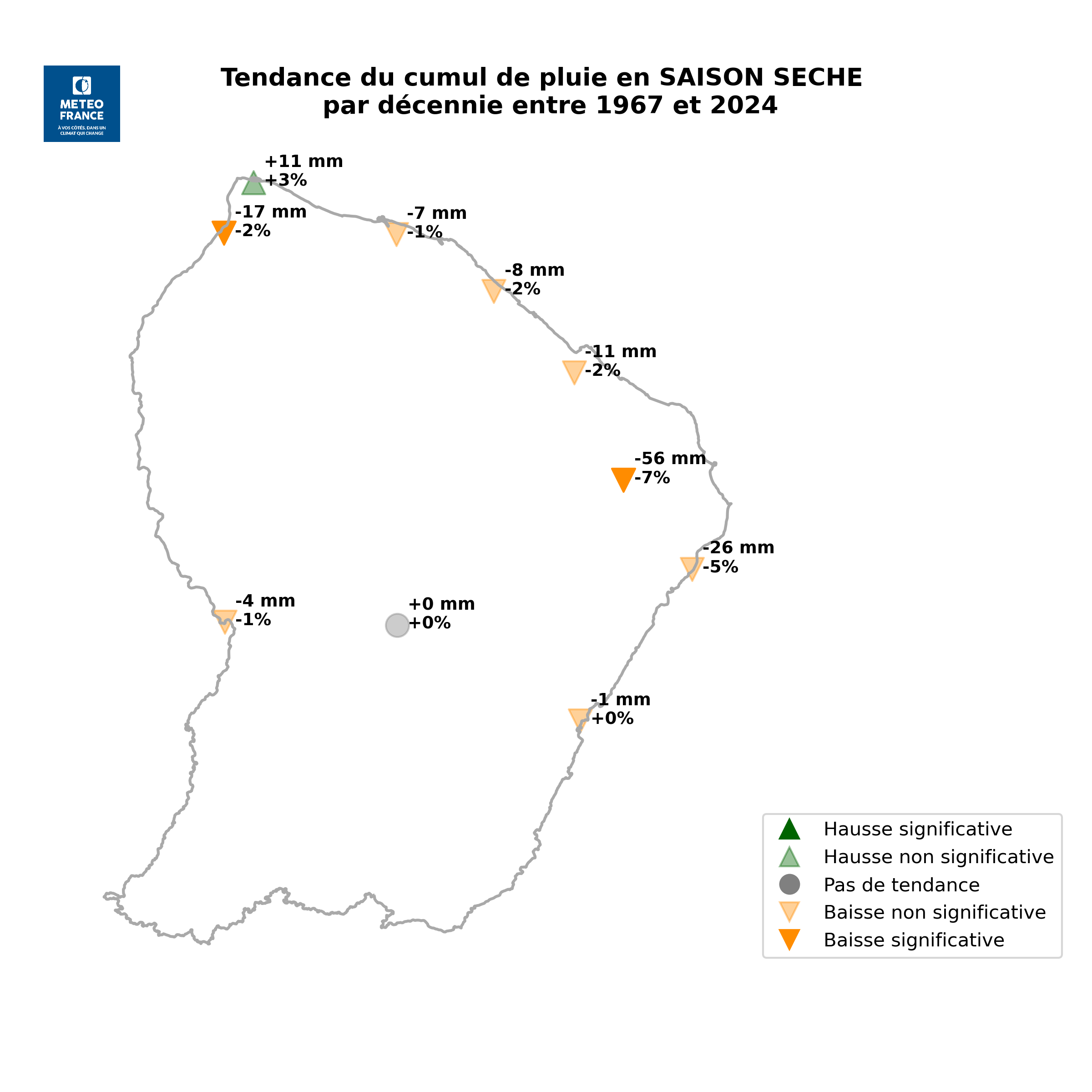 A l’échelle saisonnière, seule la saison sèche (juillet à novembre) enregistre des baisses de pluie significatives, et ce uniquement dans le Nord-Est continental et sur l’Axe Petit-Saut/Saint-Laurent. Néanmoins durant cette saison, la quasi-totalité des stations enregistre des tendances à la baisse, même si ces dernières ne sont pas statistiquement significatives au regard de la variabilité propre des précipitations.