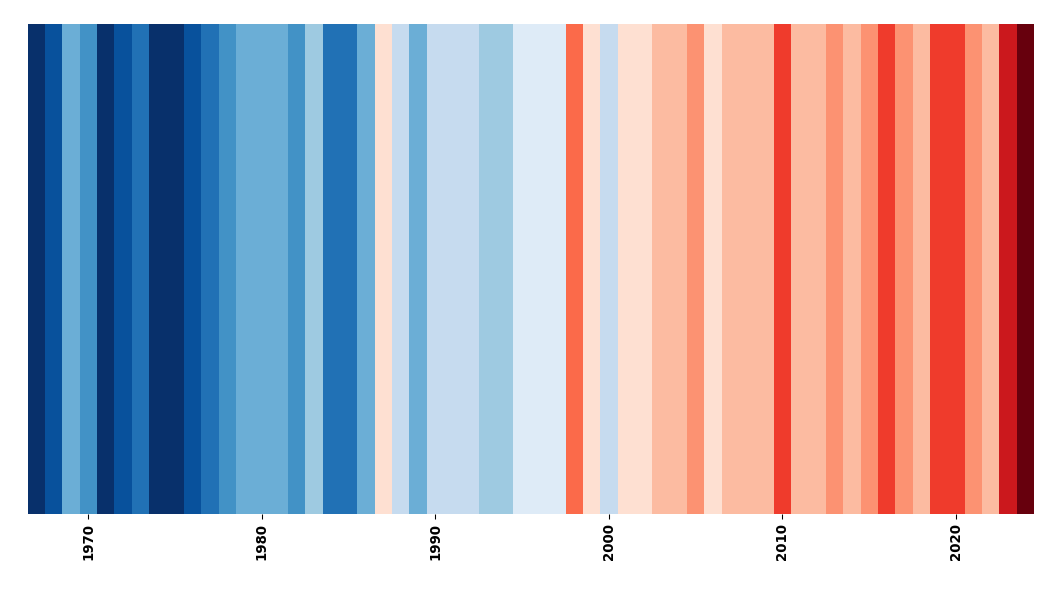 Les warming stripes (« bandes de réchauffement ») offrent une synthèse visuelle de ce réchauffement (Figure 2). Avec une période de référence 1991-2020, la plupart des années chaudes (bandes rouges) se sont produites après 2003.