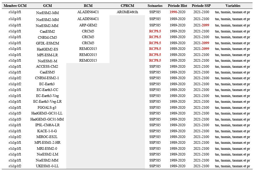• le ssp5-8.5 pour les simulations CMIP6 (GCM - ALADIN - AROME).