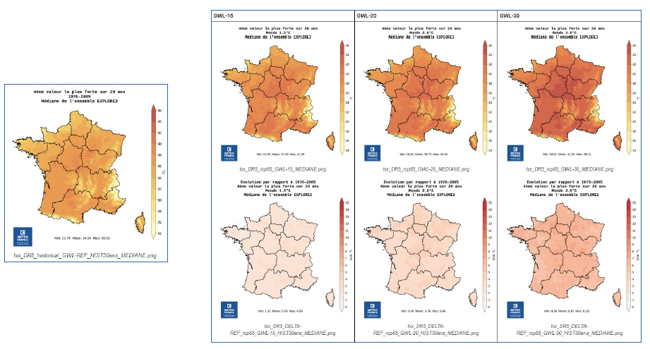 Figure 4 : À gauche la moyenne de référence sur la période 1976-2005 de l’extrême chaud de la température maximale quotidienne, à droite les évolutions (valeur absolue en haut et écart en bas) pour les trois horizons de la TRACC