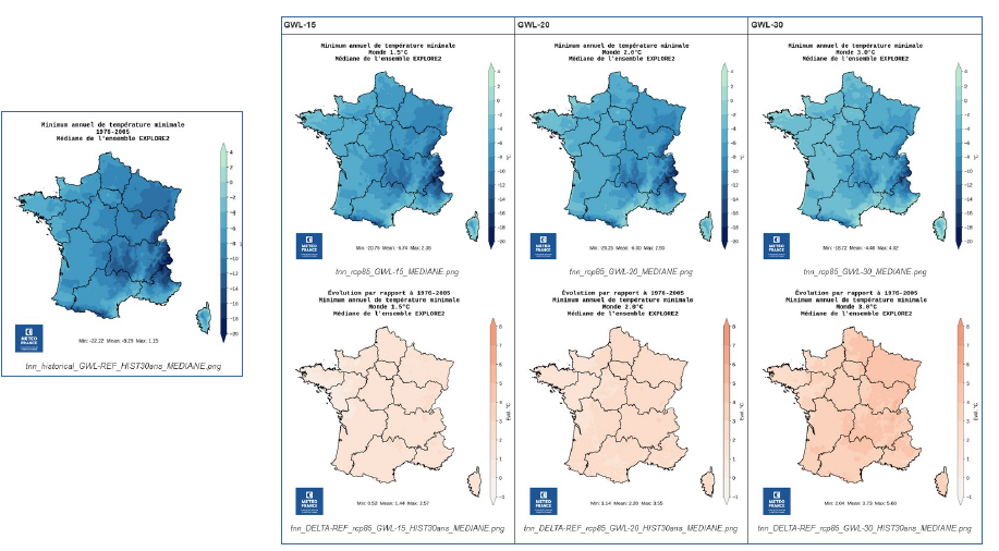 Figure 3 : À gauche la moyenne de référence sur la période 1976-2005 de l’extrême froid de la température minimale quotidienne, à droite les évolutions (valeur absolue en haut et écart en bas) pour les trois horizons de la TRACC