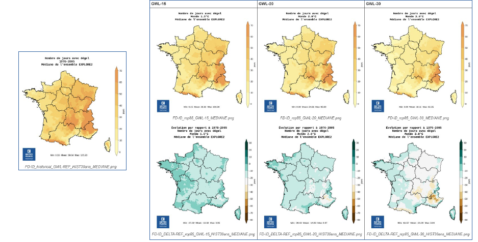 Figure 5 : À gauche la moyenne de référence sur la période 1976-2005 du nombre de jours de dégel, à droite les évolutions (valeur absolue en haut et écart en bas) pour les trois horizons de la TRACC