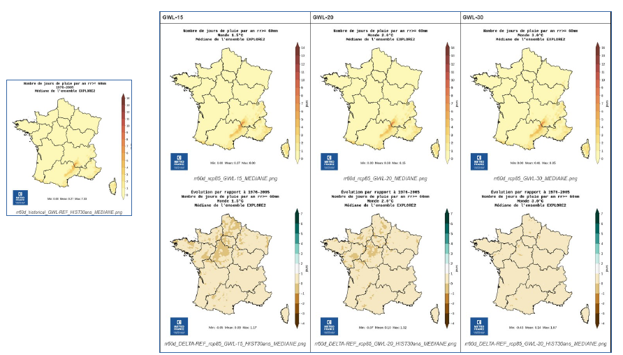 Figure 2 : À gauche la moyenne de référence sur la période 1976-2005 du nombre de jours de pluie supérieur à 60 mm, à droite les évolutions (valeur absolue en haut et écart en bas) pour les trois horizons de la TRACC